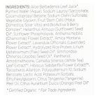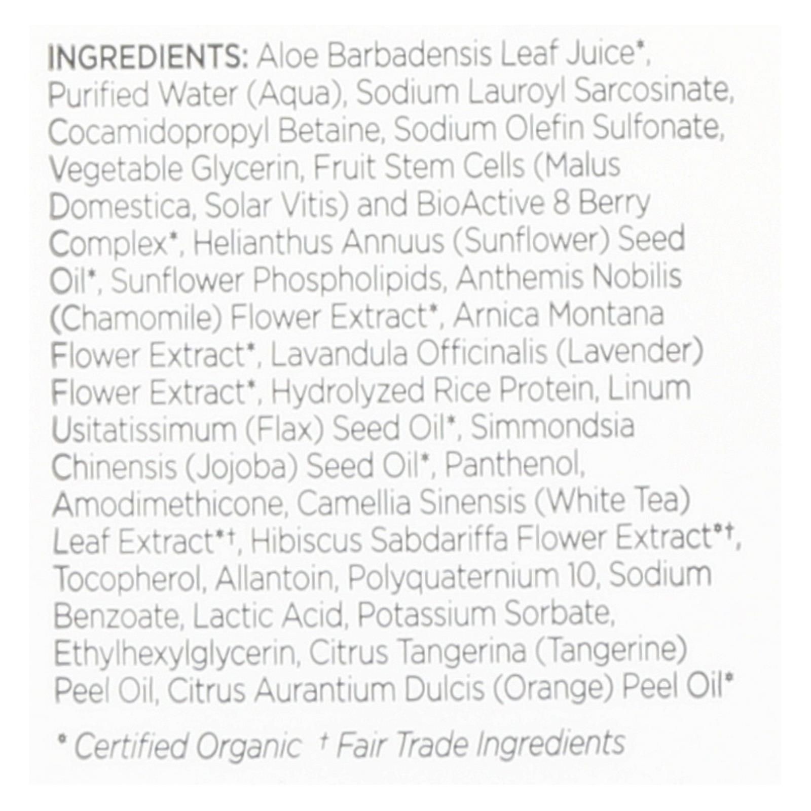 ingredients : aloe barbadensis leaf juice;purified water;aqua;sodium lauroyl sarcosinate;cocamidopropyl betaine;sodium olefin sulfonate;vegetable glycerin;fruit stem cells;malus domestica;solar vitis;and bioactive 8 berry complex;helianthus annuus;sunflower;seed oil;sunflower phospholipids;anthemis nobilis;chamomile;flower extract;arnica montana flower extract;lavandula officinalis;lavender;hydrolyzed rice protein;linum usitatissimum;flax;simmondsia chinensis;jojoba;panthenol;amodimethicone;camellia sinensis;