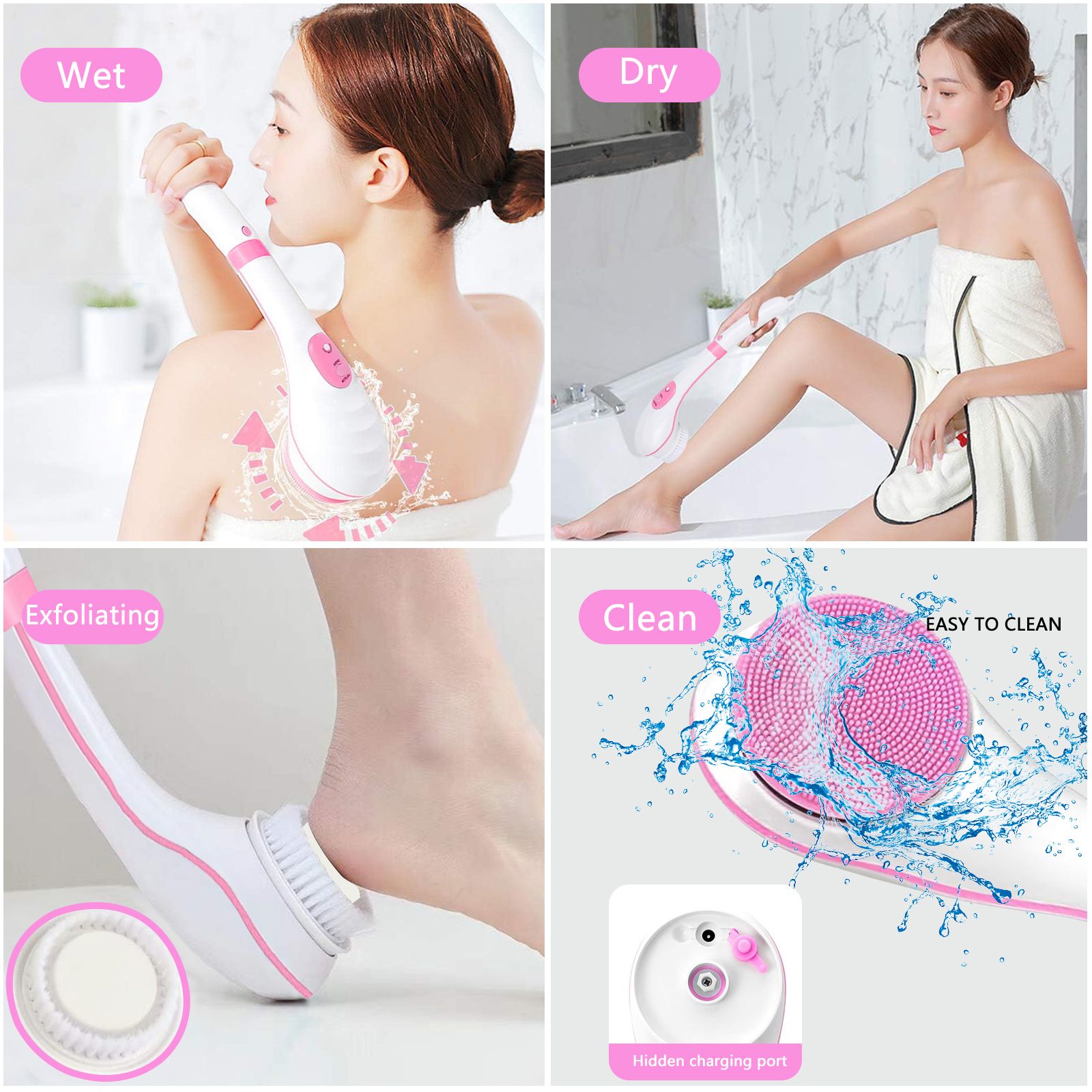 IPX7 water resistant is perfect for use in the shower or bath. With the detachable handle, you can easily scrub your back or other hard-to-reach areas on your body.br> 5 Different Functions Brush Heads